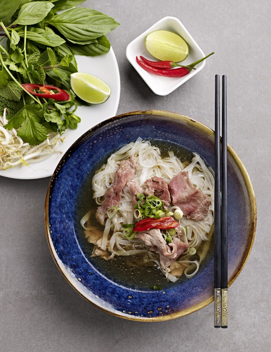 Rindfleisch mit Chili, Basilikum, Sojasprossen, Karotten und Röstzwiebeln