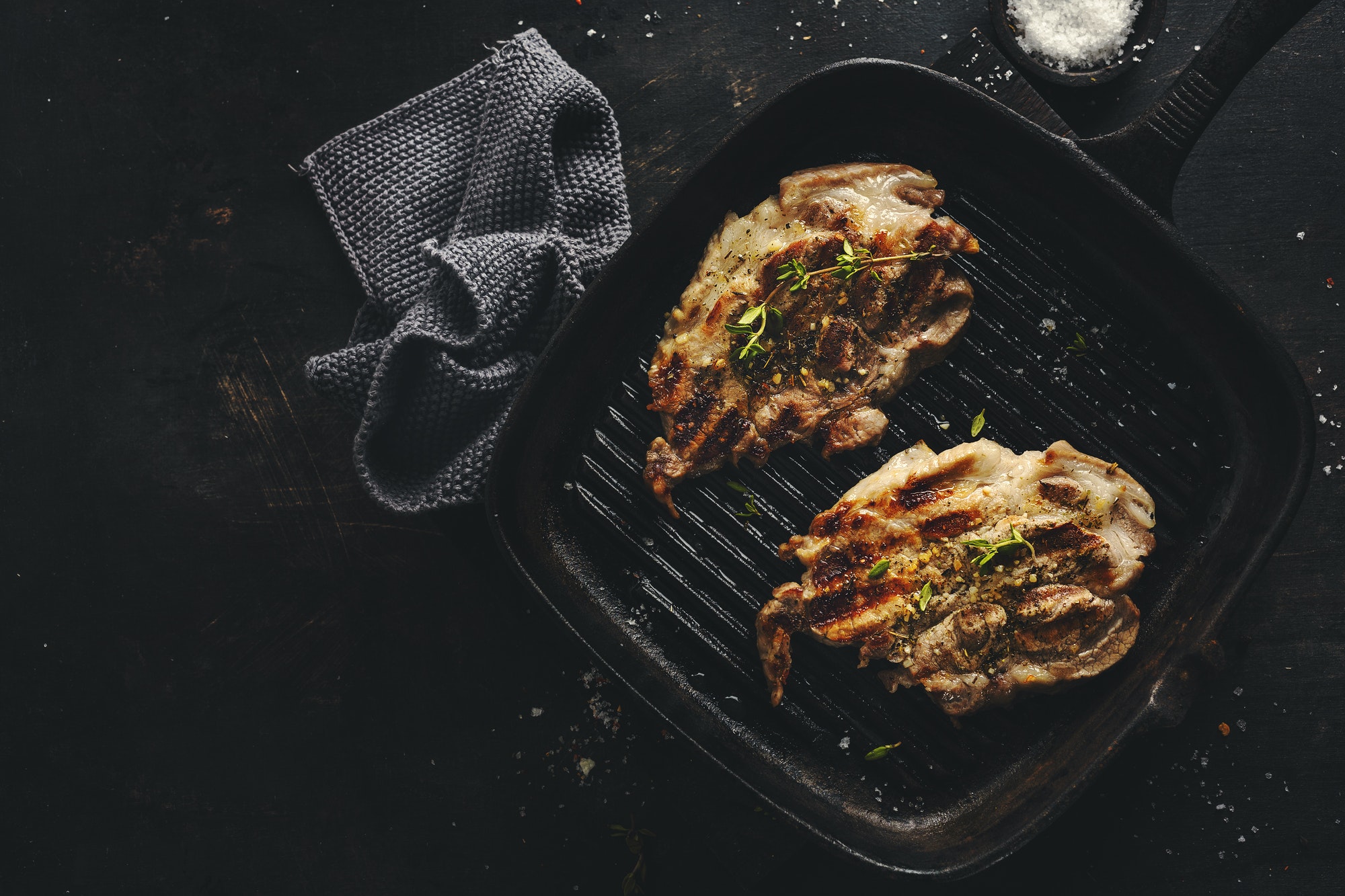 Hühnerfleisch gebraten mit frischem Gemüse, Ingwer und grünem Pfeffer serviert im Feuertopf. Dazu Salat und verschiedene Kräuter.
